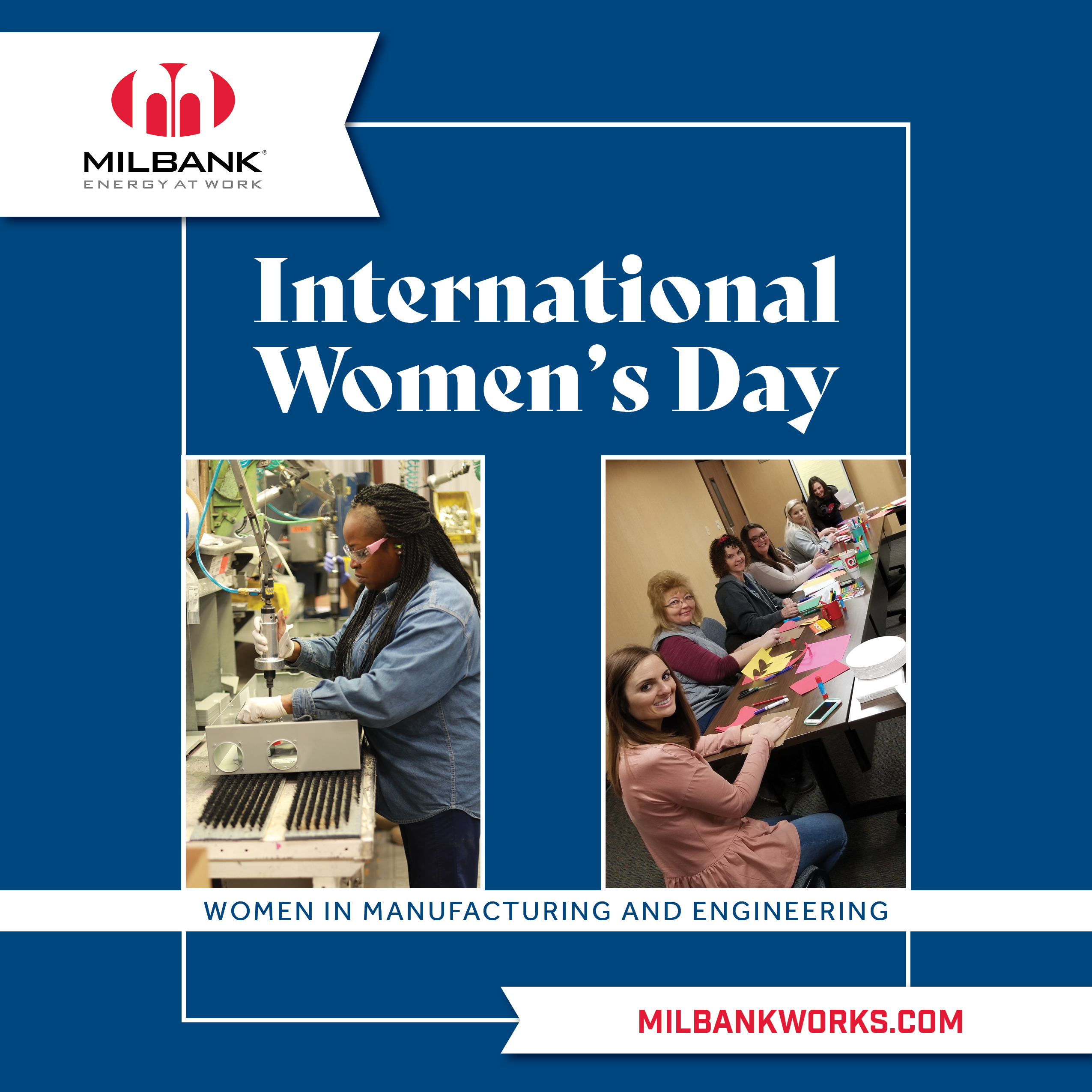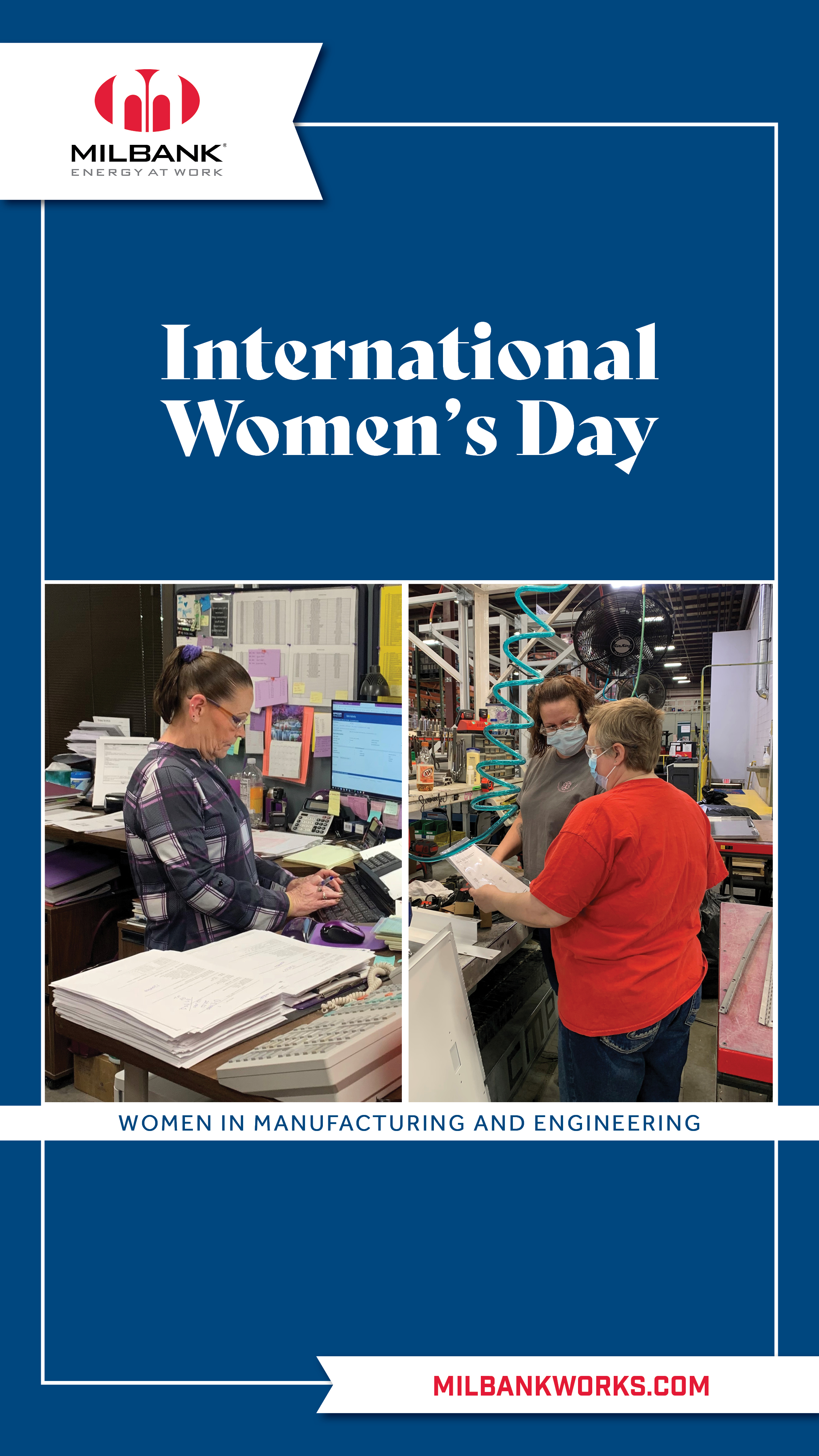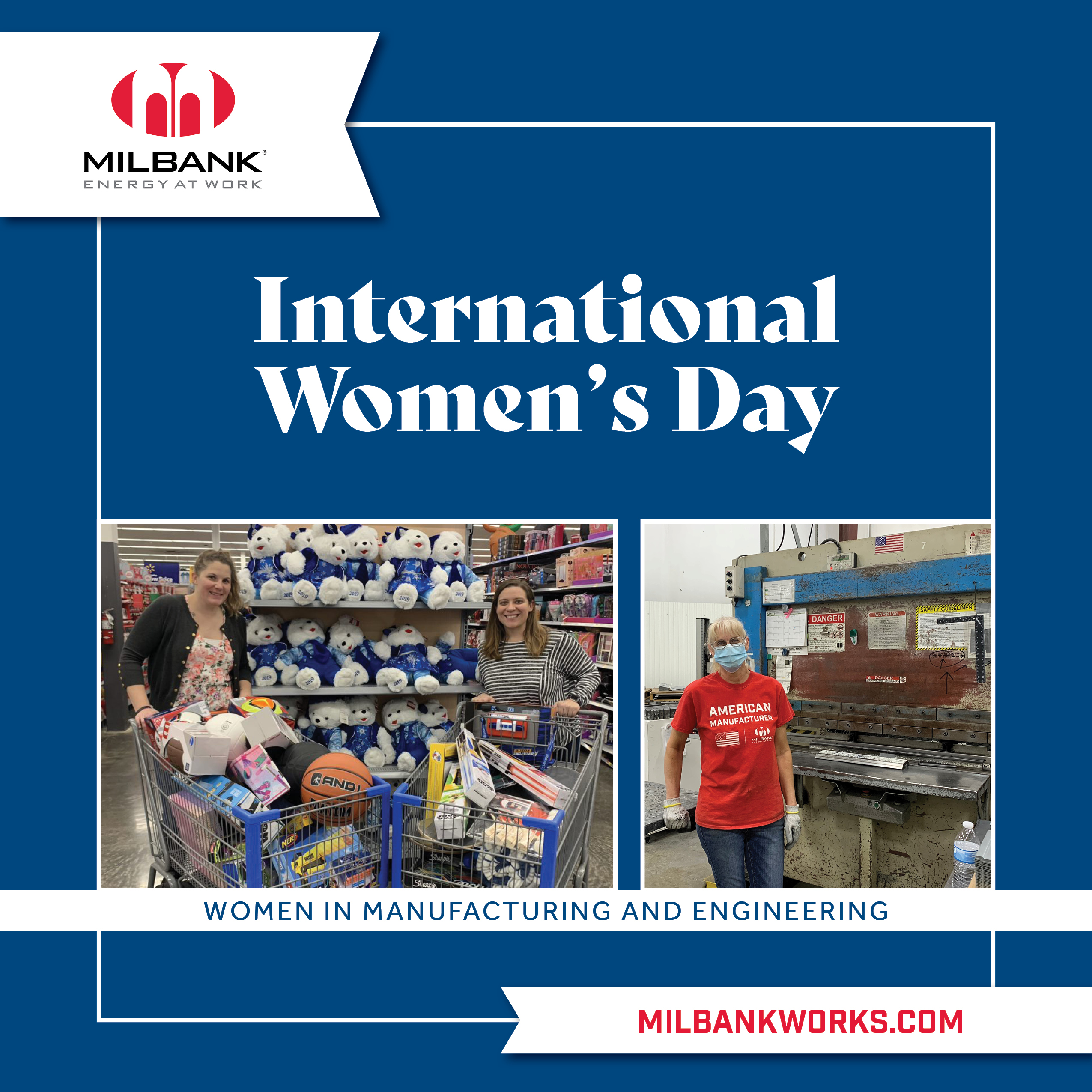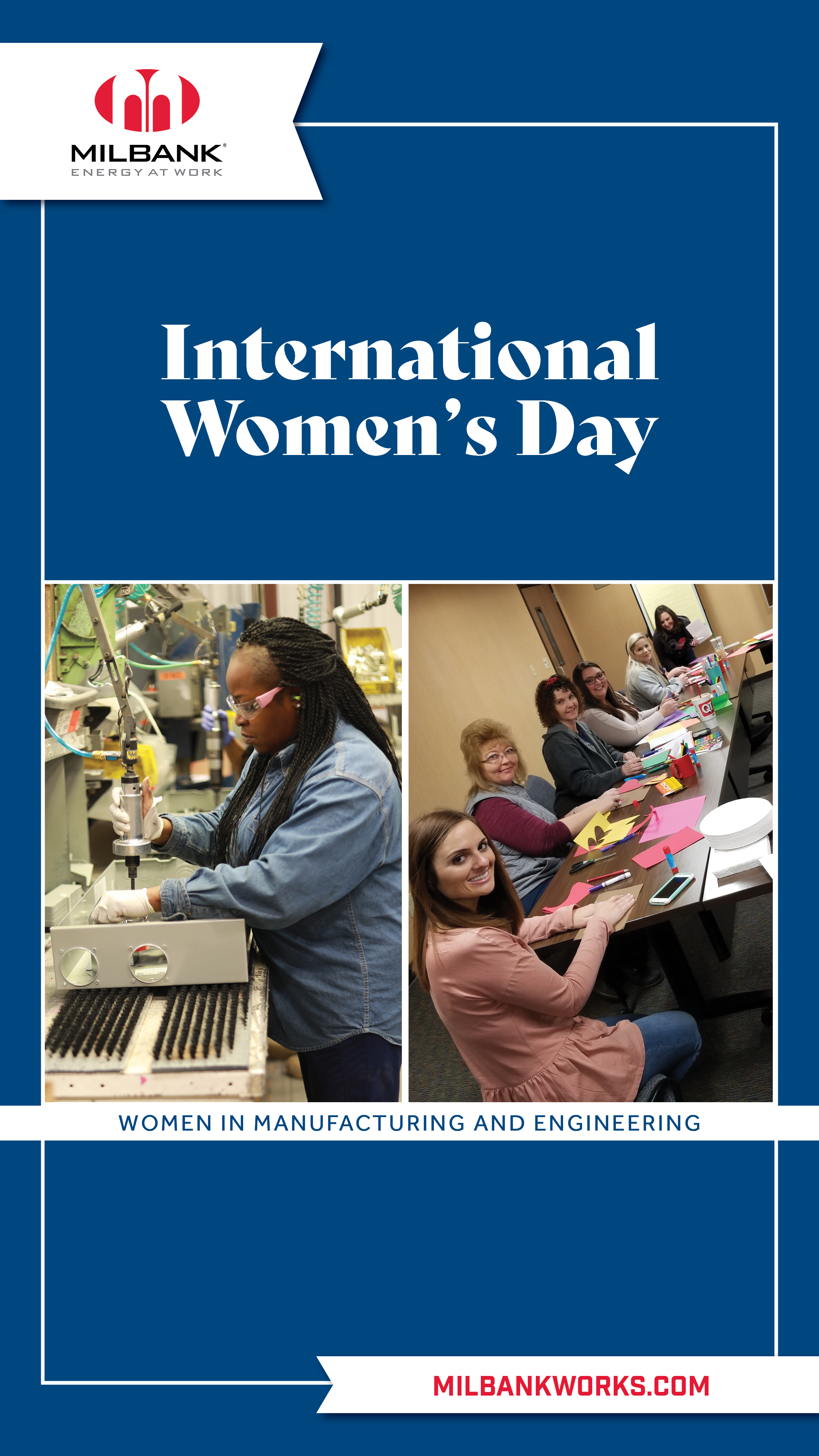 Branded social media graphics for Milbank Manufacturing celebrating International Women's Day 2021; created for Instagram, Facebook, LinkedIn, and Twitter