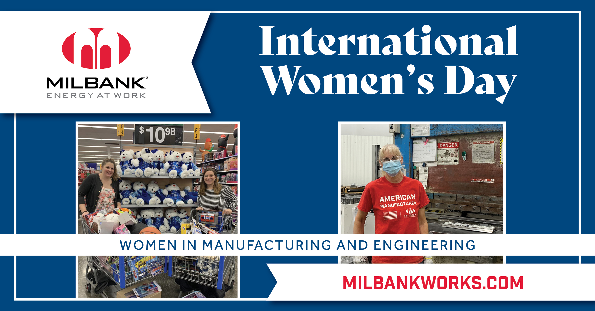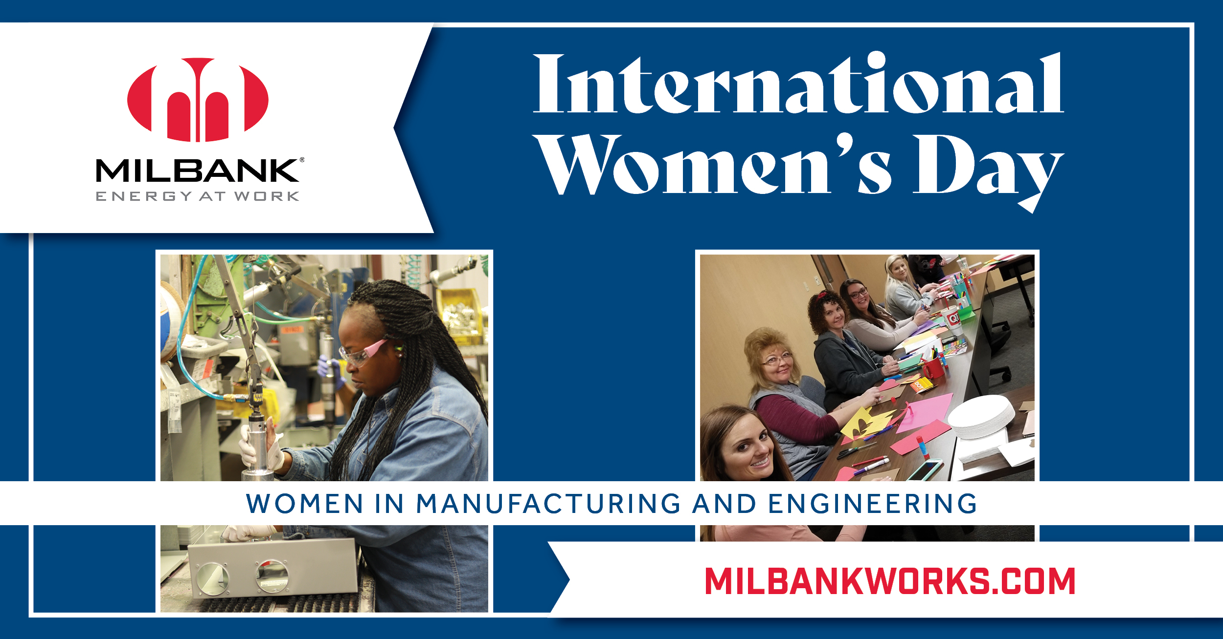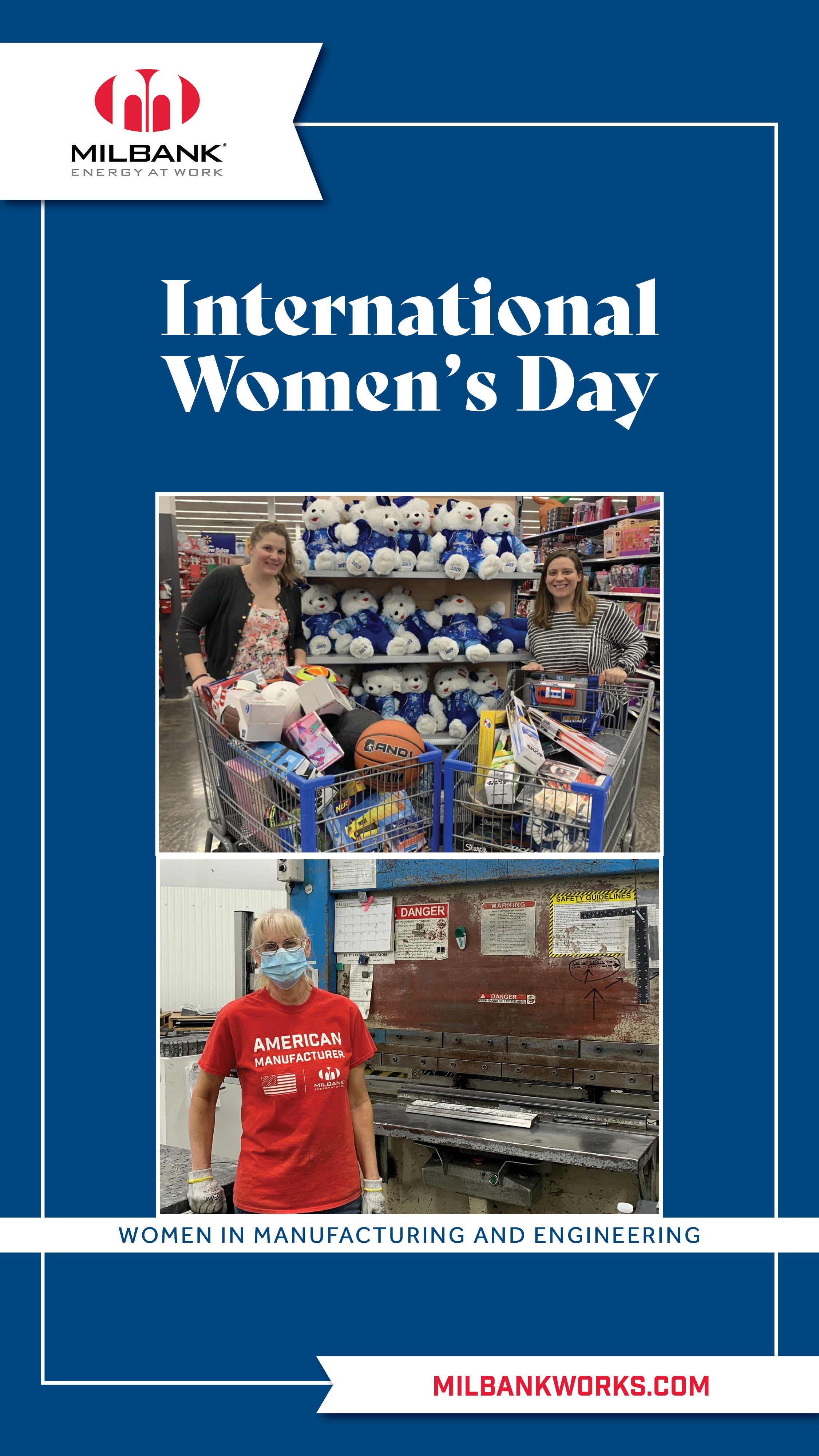 Branded social media graphics for Milbank Manufacturing celebrating International Women's Day 2021; created for Instagram, Facebook, LinkedIn, and Twitter